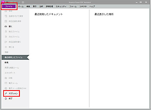 Nuance® Power PDF Standardを起動して、「ファイル」メニューの「オプション」をクリックします。
