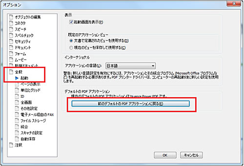 「全般」の「起動」をクリックし、[前のデフォルトのPDFアプリケーションに戻る]ボタンをクリックします。